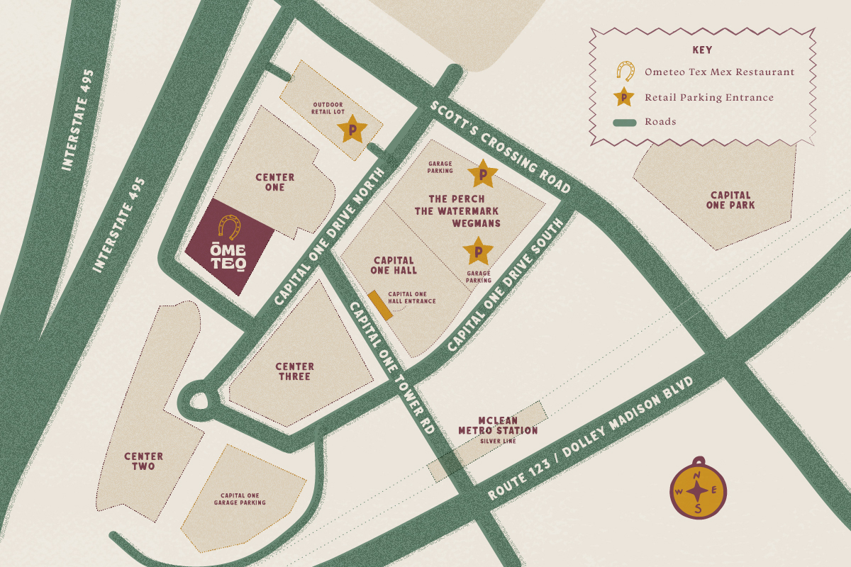 Ometeo is located only a couple blocks from the McLean Metro Station which serves the Silver Line, located along Dolly Madison Boulevard ( Route 123 ) and is accessible from Scotts Crossing Road.